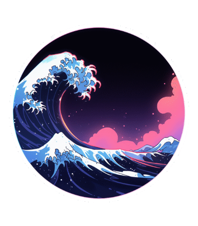 This sticker shows a powerful ocean wave rising under a dreamy night sky with glowing pink clouds and stars.