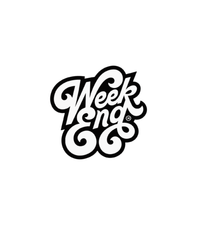 Retro script sticker: “Week End” in flowing, stacked lettering with bold white fill and black offset.