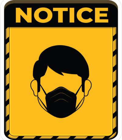 Yellow notice sticker showing a person wearing a safety mask.Mask required safety sign for workplace protection.Notice icon reminding workers to wear protective face masks.”