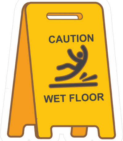 “Yellow caution sign showing ‘Wet Floor’ warning.Safety sticker with slip hazard symbol.Classic wet floor warning sign sticker.”